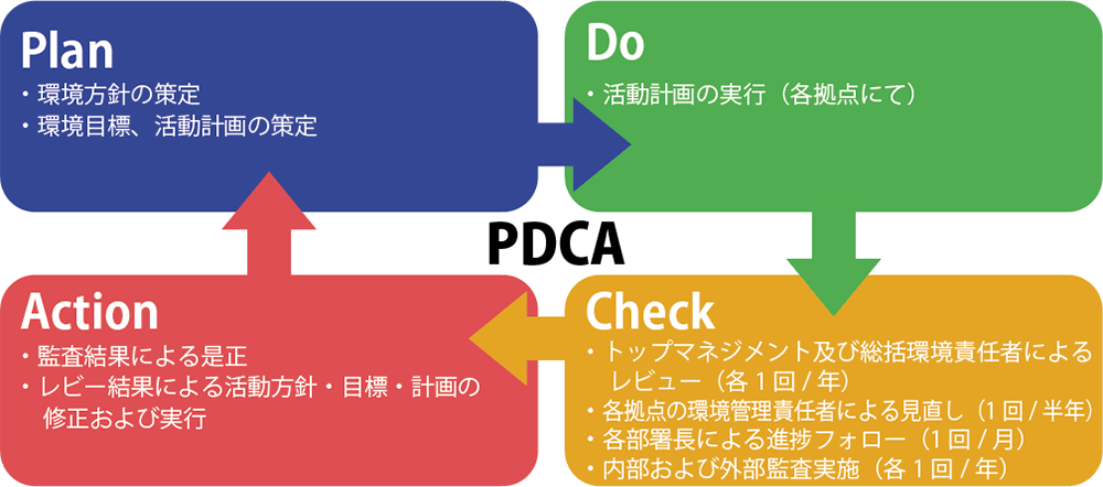 当グループのEMSはISO14001が要求する継続的な改善が通常の事業活動内で実施できる仕組みにしており、自然とPDCAが回るようになっております。