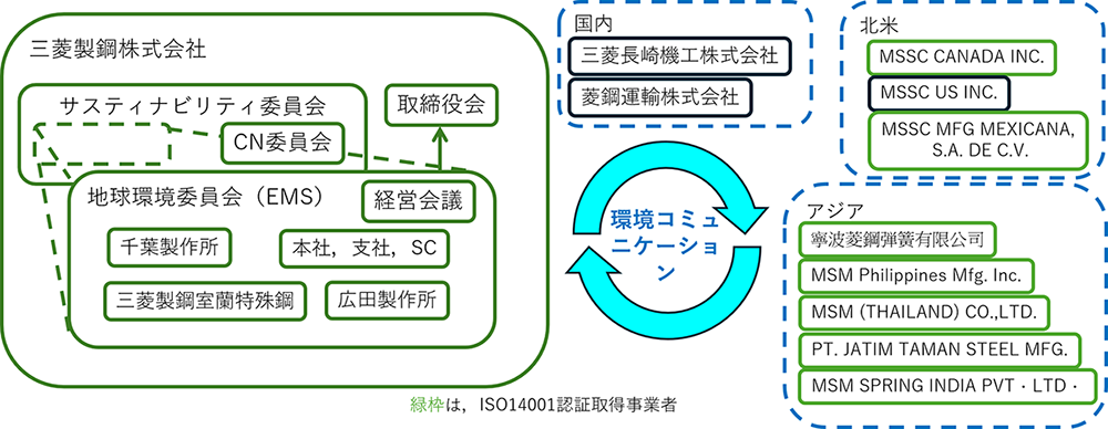 当グループ内ではそれぞれの拠点に置かれている状況に応じてEMSを構築しており、グループ間におけるコミュニケーションをとりながら環境方針に基づいて活動しています。そのイメージを下図に示します。