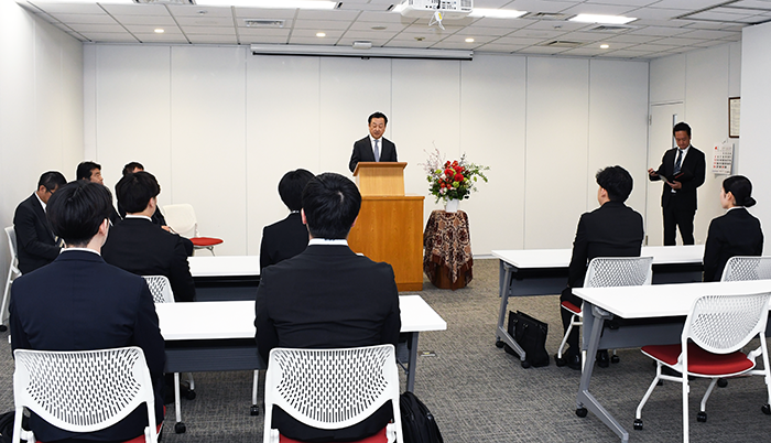 皆さん入社おめでとうございます。社長の山口です。本日、ここに6名の新しい仲間を迎えることができ、大変嬉しく思っております。三菱製鋼を代表してお祝いすると共に、皆さんを心から歓迎いたします。