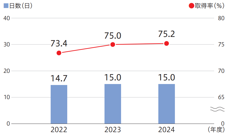 また、2022年度より年次有給休暇取得率75%達成を目標に掲げ、休日前後の有給休暇を取得しやすくする「プラスONEキャンペーン」を実施するなど、「有給休暇を取得しやすい」職場風土づくりにも取り組んでいます。