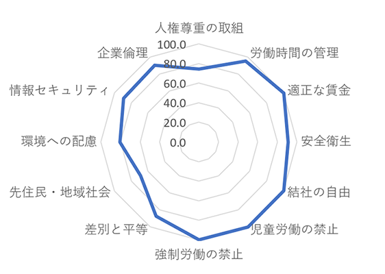 抽出したリスクに基づき、自社及びサプライヤー向けの人権デュー・ディリジェンスにおいては、次のような調査項目を設定いたしました。サプライチェーン向け人権デュー・ディリジェンスはさらに環境・社会・ガバナンスに関連する項目を調査項目に加え、次のような結果になりました。